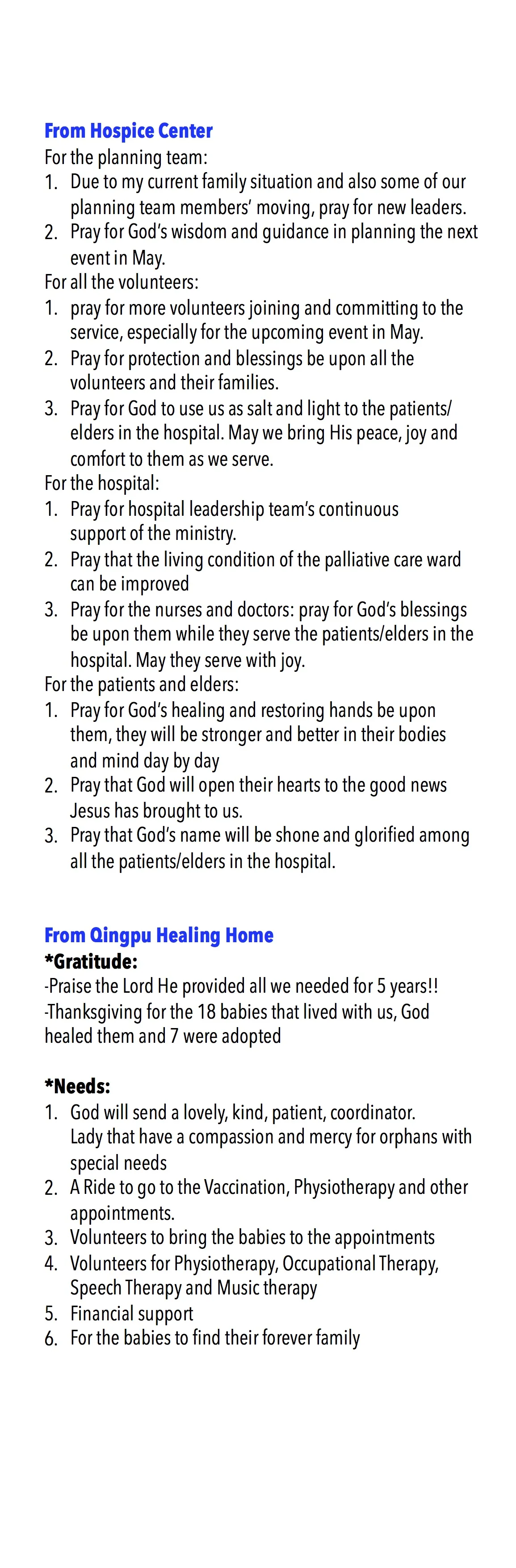 Besides those already included in the Guide, here is a list of additional prayer requests from organizations serving the poor and needy in Shanghai and in China. Let's serve them through our prayers...
